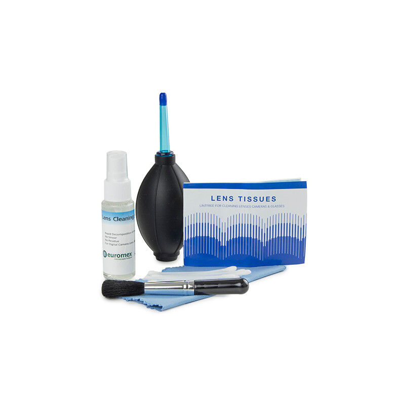 Čistiaca súprava: tekutina na čistenie objektívu, handrička na čistenie objektívu bez chĺpkov, kefka, vzduchová žiarovka a vatové tyčinky