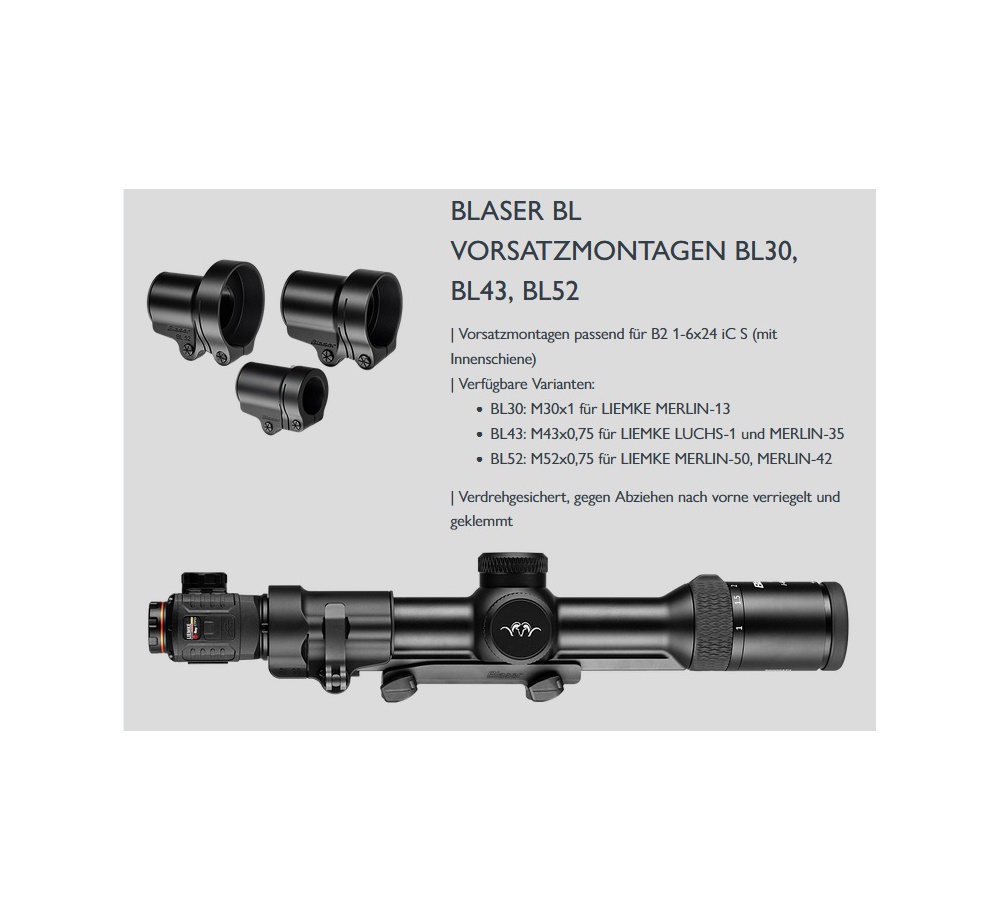 V kombinácii s ľahko montovateľnými, absolútne opakovateľnými nadstavcami a zodpovedajúcou optikou uchytenia sa puškohľady Blaser B2 stávajú skutočnými špecialistami na nočný lov.