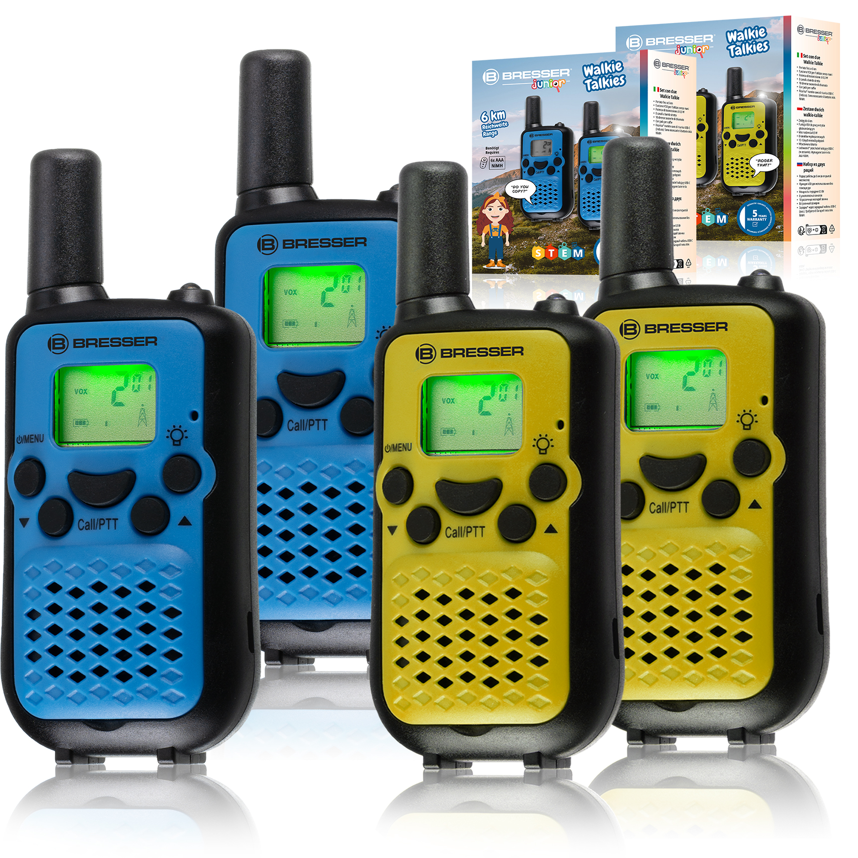 Objavujte svet a zostaňte v kontakte - s vysielačkami BRESSER JUNIOR pre deti sa v okamihu vydáte za novým dobrodružstvom! Vyberte si obľúbenú farbu a vyrazte do prírody! Rozdeľte sa a navzájom sa informujte o svojich vzrušujúcich objavoch alebo si pomocou vysielačiek vymieňajte tajné správy o svojich súperoch! Aby ste zabránili odpočúvaniu, môžete kontrolovať hlasitosť a vybrať si z 8 rôznych úzkopásmových kanálov. Vďaka ultradlhému dosahu až 6 km môžete zostať v kontakte s ostatnými aj na veľké vzdialenosti. Vysielačky majú na výber aj 10 rôznych zvonení.