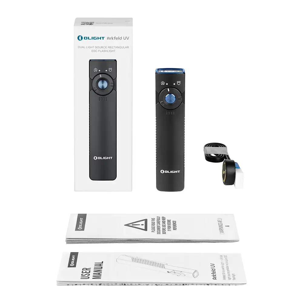 LED baterka Olight Arkfeld predstavuje prvé svietidlo na trhu, ktorá disponuje LED osvetlením v kombinácii s UV svetlom. Disponuje možnosťou výberu z piatich úrovní jasu. Jej maximálny výkon je úctyhodných 1000 lm. Zabudované UV svetlo vyžaruje silné 580 mW svetlo s vlnovou dĺžkou 365 nm. Môžete si tak posvietiť na veci, ktoré nie sú voľným okom viditeľné. Jej telo je vyrobené zo zliatiny hliníka, ktorý má tie najlepšie predpoklady na dlhú životnosť a odolnosť voči rozbitiu.