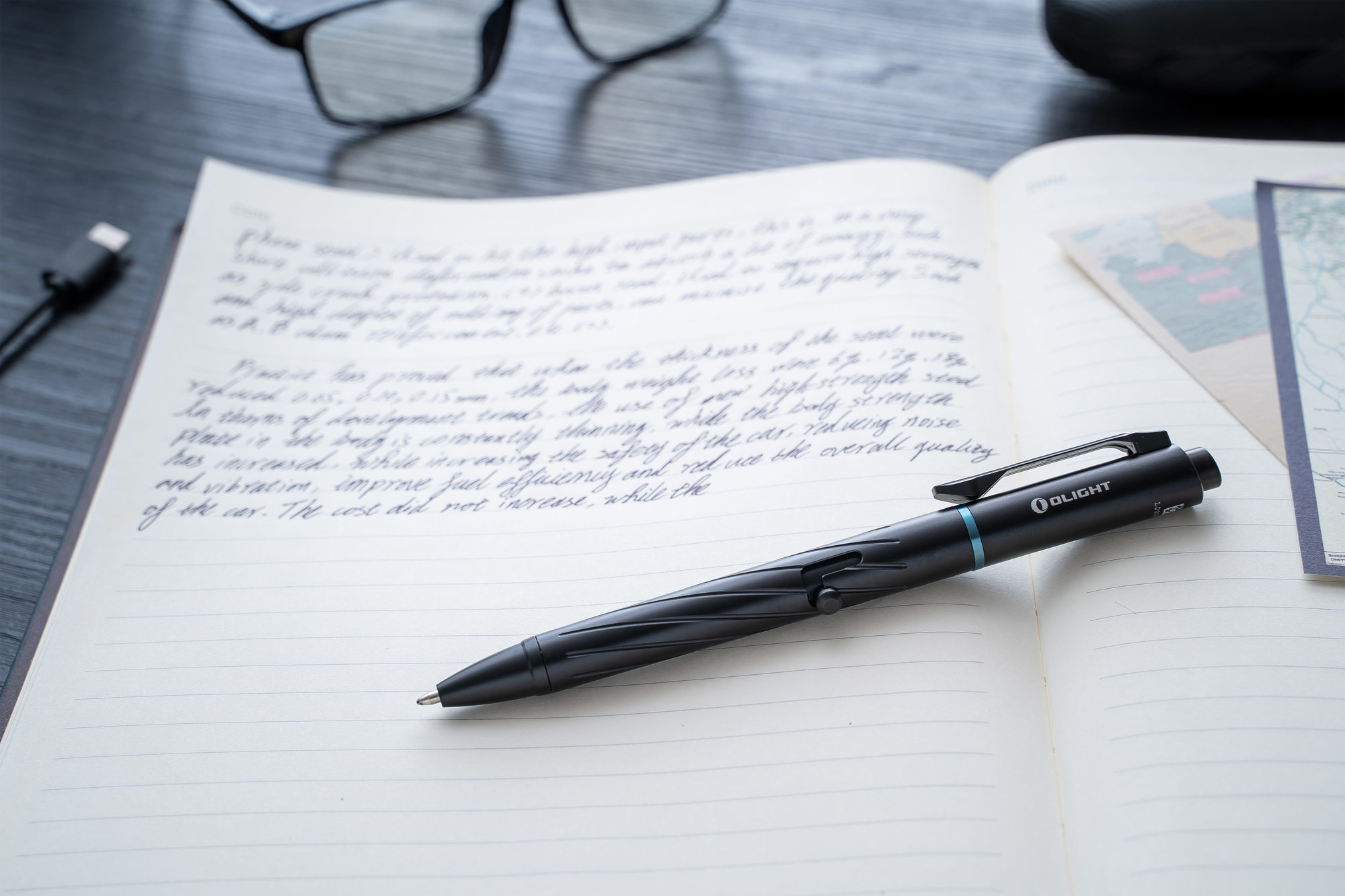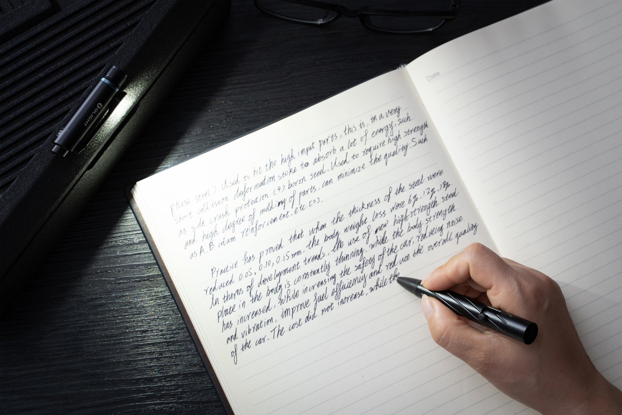 Disponuje sponou, ktorá zaručí, že pero budete mať vždy pri sebe. Či už na vrecku nohavíc alebo na vrecku košele. V oblasti LED časti je zabudovaný zelený laser, ktorý predstavuje takzvaný " ukazovateľ ". Či už na ukázanie smeru, vysvetľovanie, ukazovanie atď. Stred tela patrí skrutke v tvare písmena L, ktorá ovláda hrot pera, LED svetlo, a zelený laser. Na svoju prevádzku využíva integrovanú nabíjateľnú batériu.