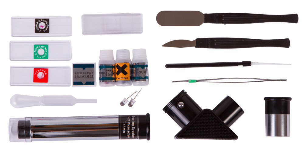 Pomocou mikroskopu môžete študovať rôzne priehľadné objekty – môže to byť tenký rez rastliny, kvapka vody z akvária, krídlo muchy atď. Sada obsahuje hotové mikropreparáty a všetko, čo potrebujete na uskutočnenie prvých biologických experimentov. Mikroskop sa dodáva s tromi objektívmi – poskytuje zväčšenia 75x, 300x a 900x.