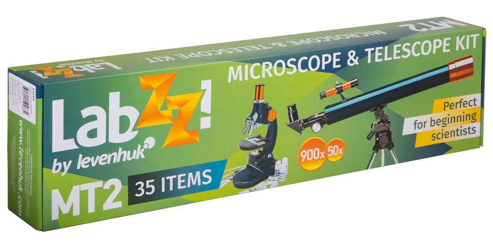 Teleskop, ktorý je súčasťou sady Levenhuk LabZZ MT2, je malý refraktor, ideálny na prvé zoznámenie sa s vesmírom. Priemer šošovky je 50 mm - tento model je vhodný pre pozorovania astronomických aj pozemských objektov.