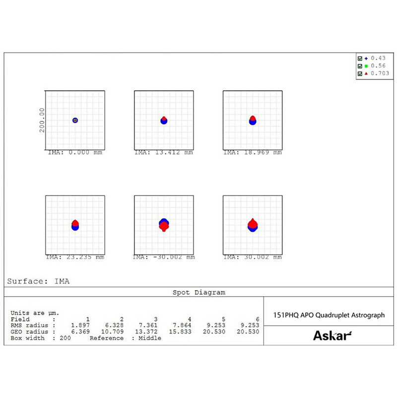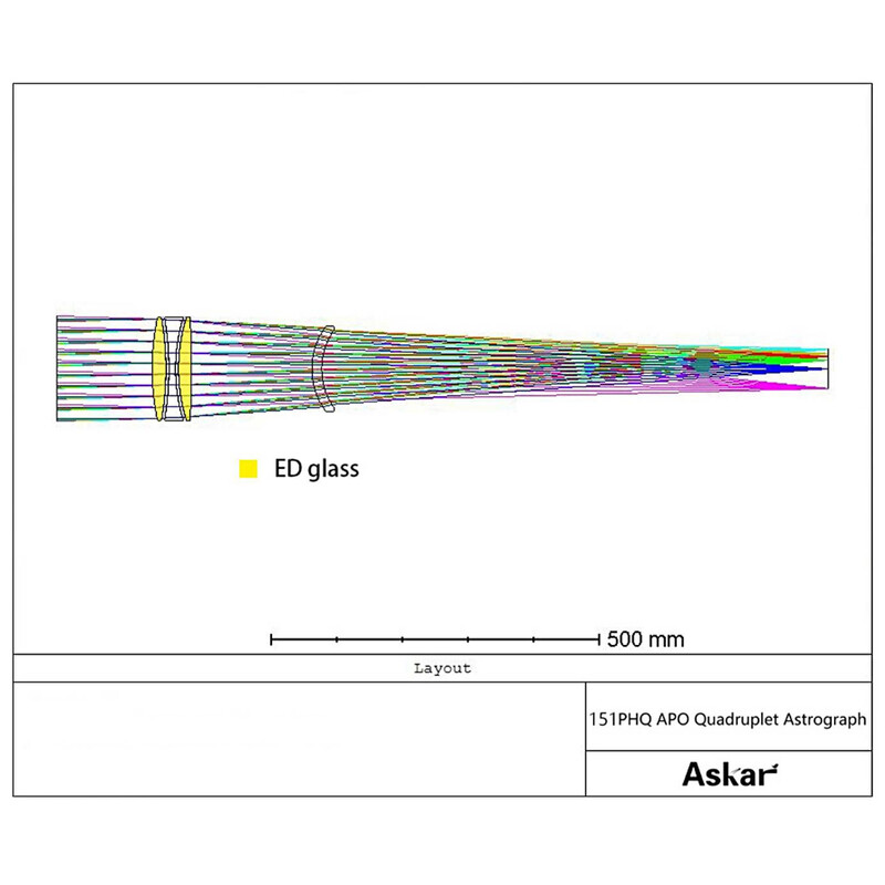 Trojitý objektív s dvoma ED sklami ponúka vynikajúcu kontrolu chromatických aberácií. Štvrtá integrovaná šošovka sa používa na vyrovnávanie obrazového poľa (flattener). Podporuje obrazový kruh 60 mm vhodný pre stredoformátové fotoaparáty CMOS, má vynikajúci bodový obraz s nepatrným skreslením okrajových hviezd a jeho stredový polomer RMS je menší ako 2 mikrometre.