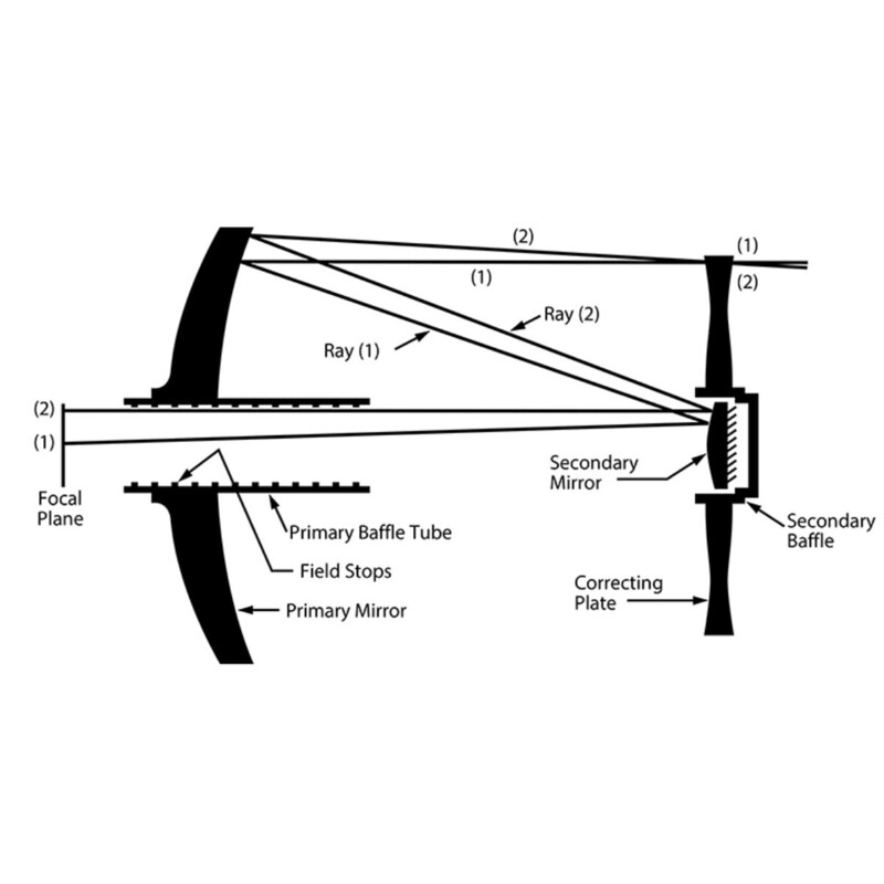 SC-Teleskope verfügen über einen sphärischen Hauptspiegel. Das ist eigentlich ein Nachteil, da nur parabolische Spiegel, wie sie in Newton-Teleskope verwendet werden, auch achsenferne Lichtstrahlen in den Brennpunkt lenken. Der Optikdesigner Bernhard Schmidt (1879-1935) entwickelte daher eine spezielle Korrekturplatte, die am vorderen Teil des Tubus angebracht ist. In Kombination mit dieser Schmidt-Platte zeigen SC-Teleskope eine scharfe Abbildung ohne sphärische Aberration. Außerdem ist der Tubus auf diese Art und Weise geschlossen, was den Hauptspiegel vor Verschmutzung schützt und störende Luftturbulenzen unterbindet.
