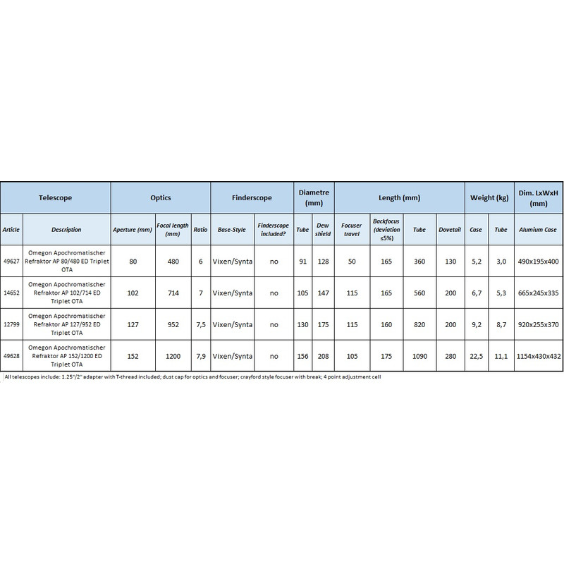 Tripletový apochromat Omegon zaujme výnimočne kvalitným spracovaním. K mimoriadnej kvalite tohto ďalekohľadu prispievajú precízne osadené montáže objektívov a vysokokvalitné prémiové ED sklo.