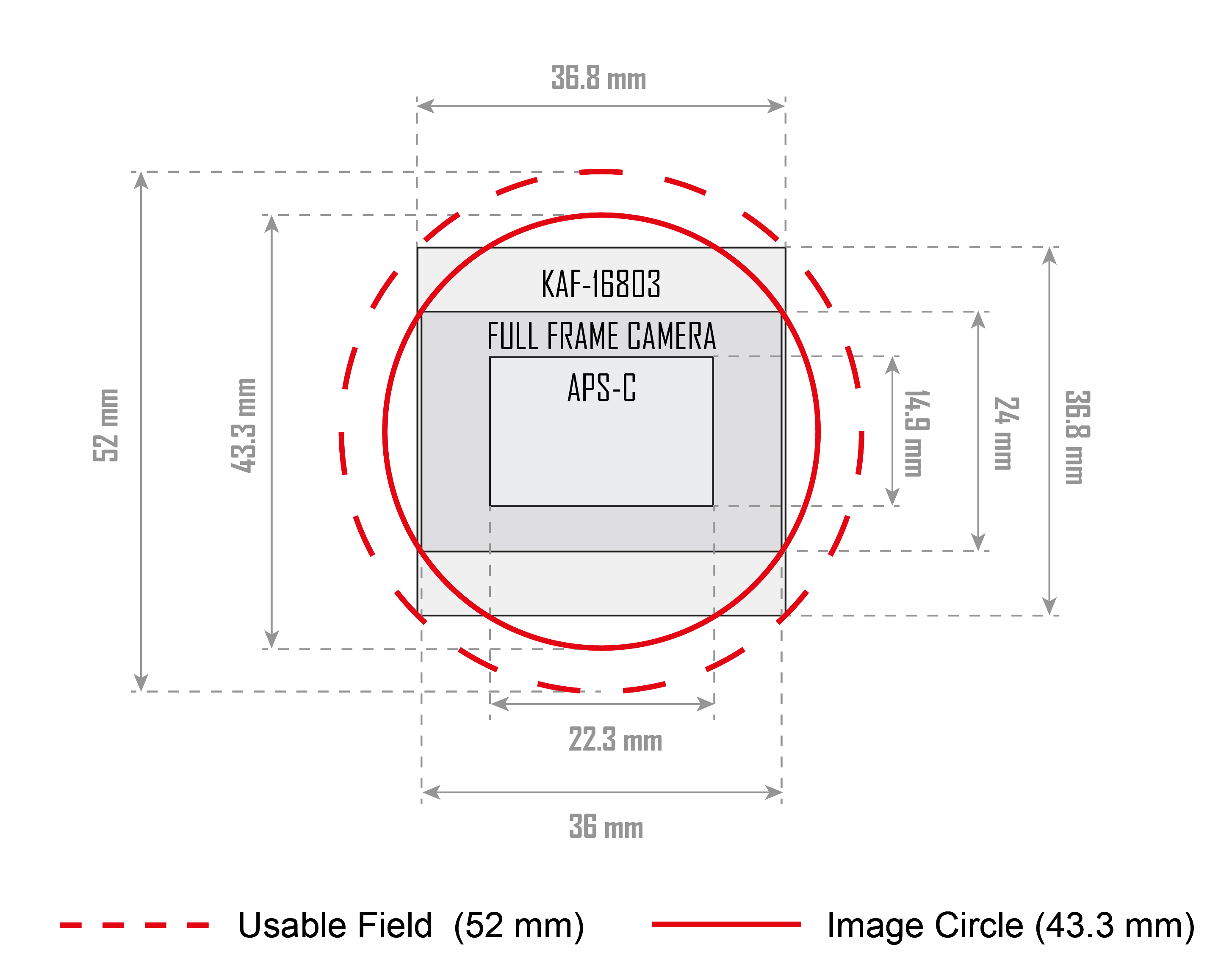 Dnes, keď sú CCD snímače rovnako veľké ako diapozitívy alebo dokonca väčšie, ponúka 11" astrograf RASA V2 Schmidt Astrograph plný 43,3 mm obrazový kruh, takže aj na veľkých snímačoch získate hviezdy ostré ako špendlík - použiteľné sú uhlopriečky až do 52 mm. Tento veľký osvetlený obrazový kruh a ohnisková vzdialenosť len 620 mm z neho robia ideálny prístroj na fotografovanie veľkých oblastí oblohy a rozsiahlych objektov. Okrem iného môžete vytvárať mozaikové snímky celej oblohy alebo loviť premenné hviezdy, supernovy či kométy.