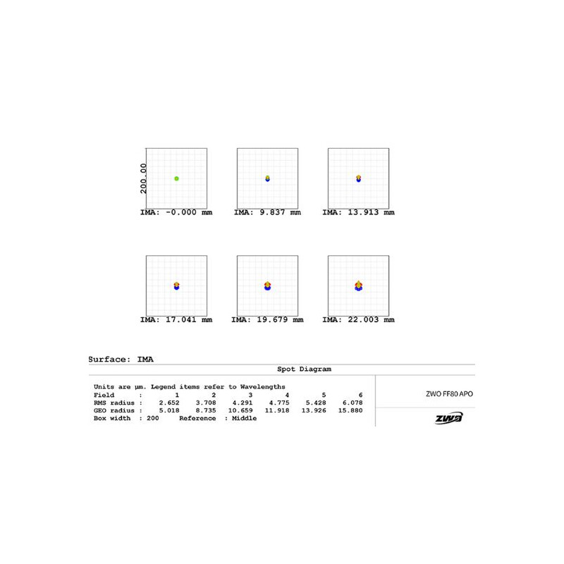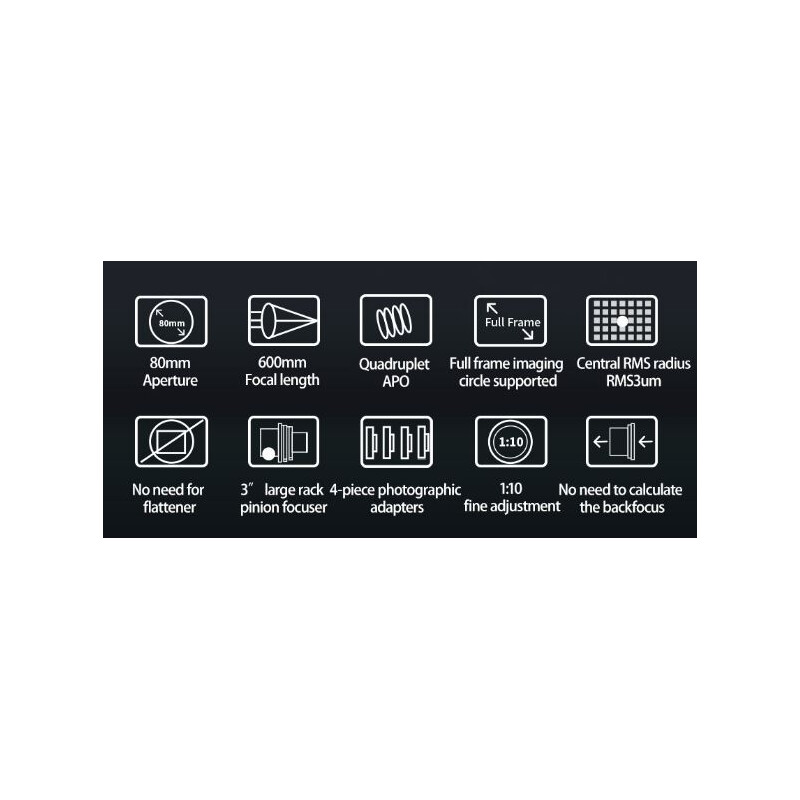 ZWO FF80 Quadruplet je veľmi kompaktný apochromatický refraktor na astrofotografiu s korigovaným zorným poľom až do plného formátu a pozorovaním až do najvyššieho rozsahu zväčšení. Teleskop má svetelnosť f/7,5 s ohniskovou vzdialenosťou 600 mm. FF80 je kvadrupletovej konštrukcie s dvomi ED sklami, čo umožňuje vynikajúce potlačenie chromatickej aberácie.