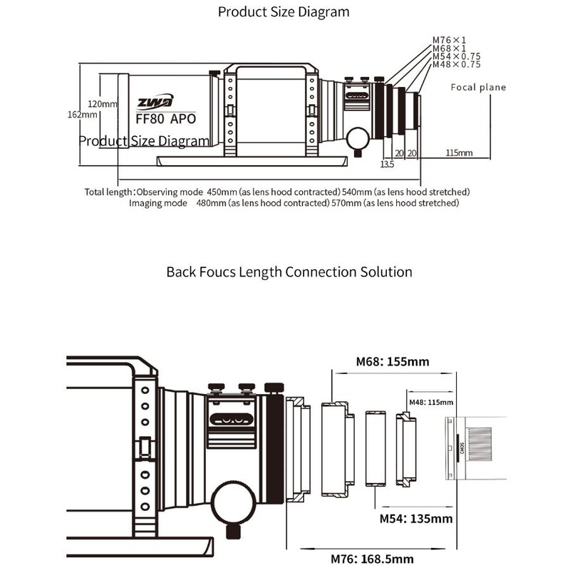 S integrovaným sploštiteľom ponúka FF80 veľké výhody v astrofotografii: osvetľuje plnoformátové snímače a zabezpečuje jemné zobrazenie s presnými hviezdami na osi. Apochromat sa dodáva s výsuvnou rosnou krytkou, 3" zaostrovacím objektívom s 360° rotáciou, päticou hľadáčika Vixen/GP a štyrmi rôznymi nástavcami na fotoaparáty (M76, M68, M54 a M48). Samotný tubus váži 3,9 kg, s objímkami tubusu a lištou je potom hmotnosť 4,7 kg.