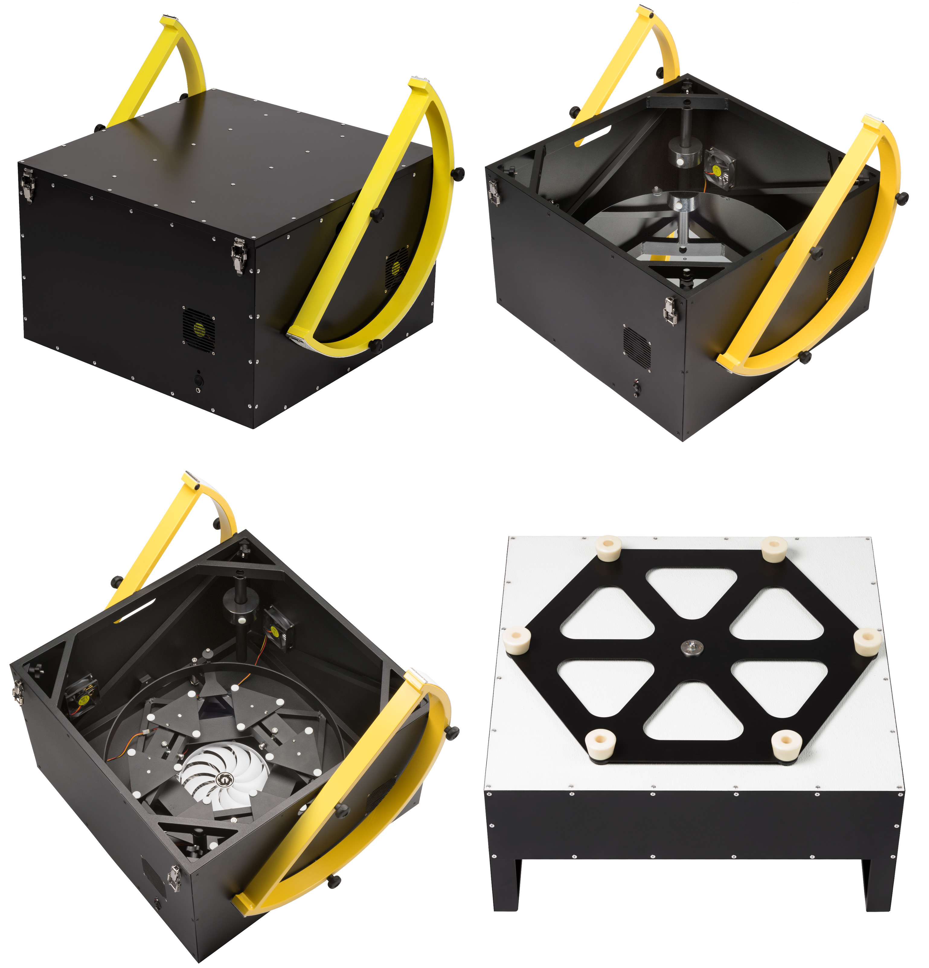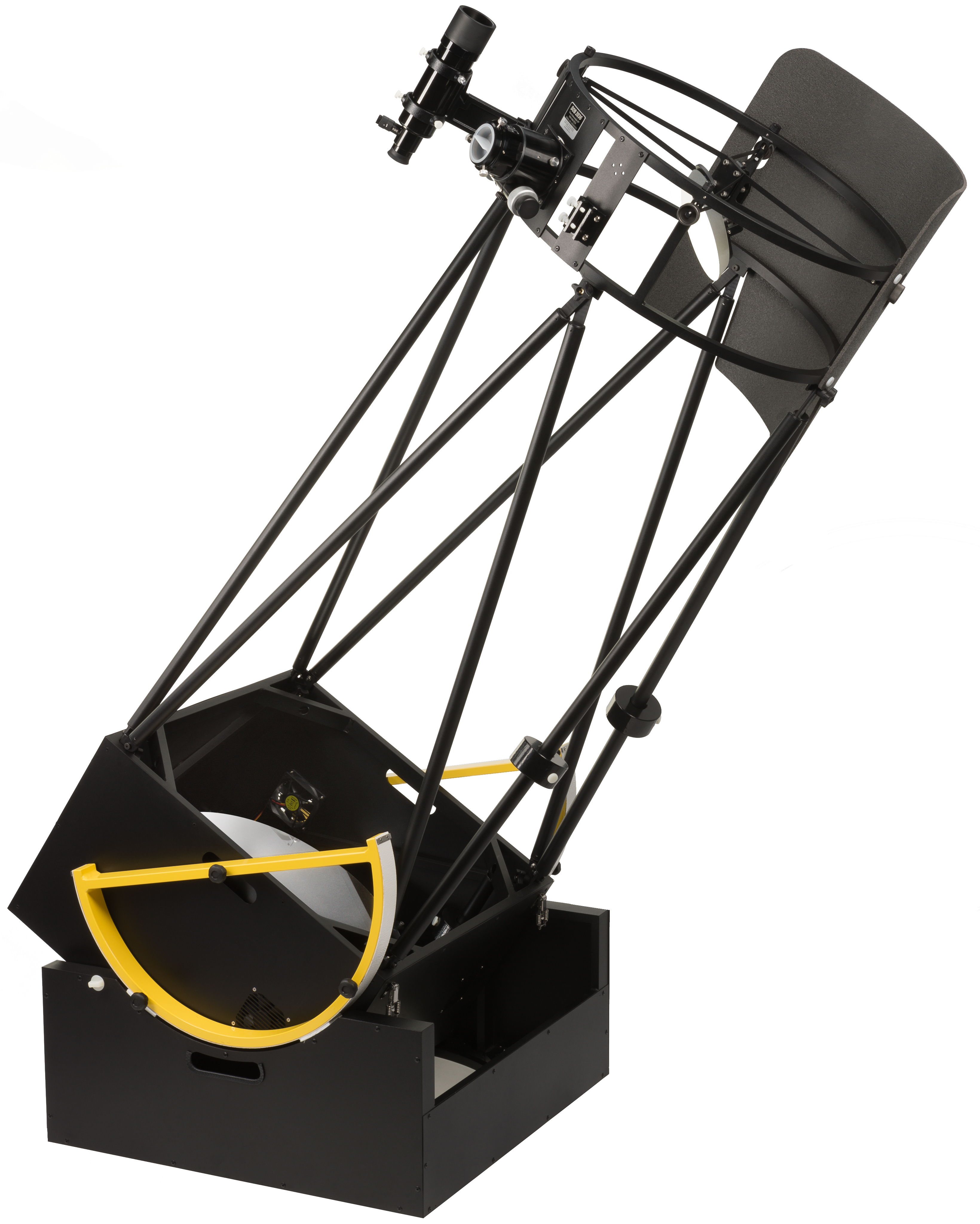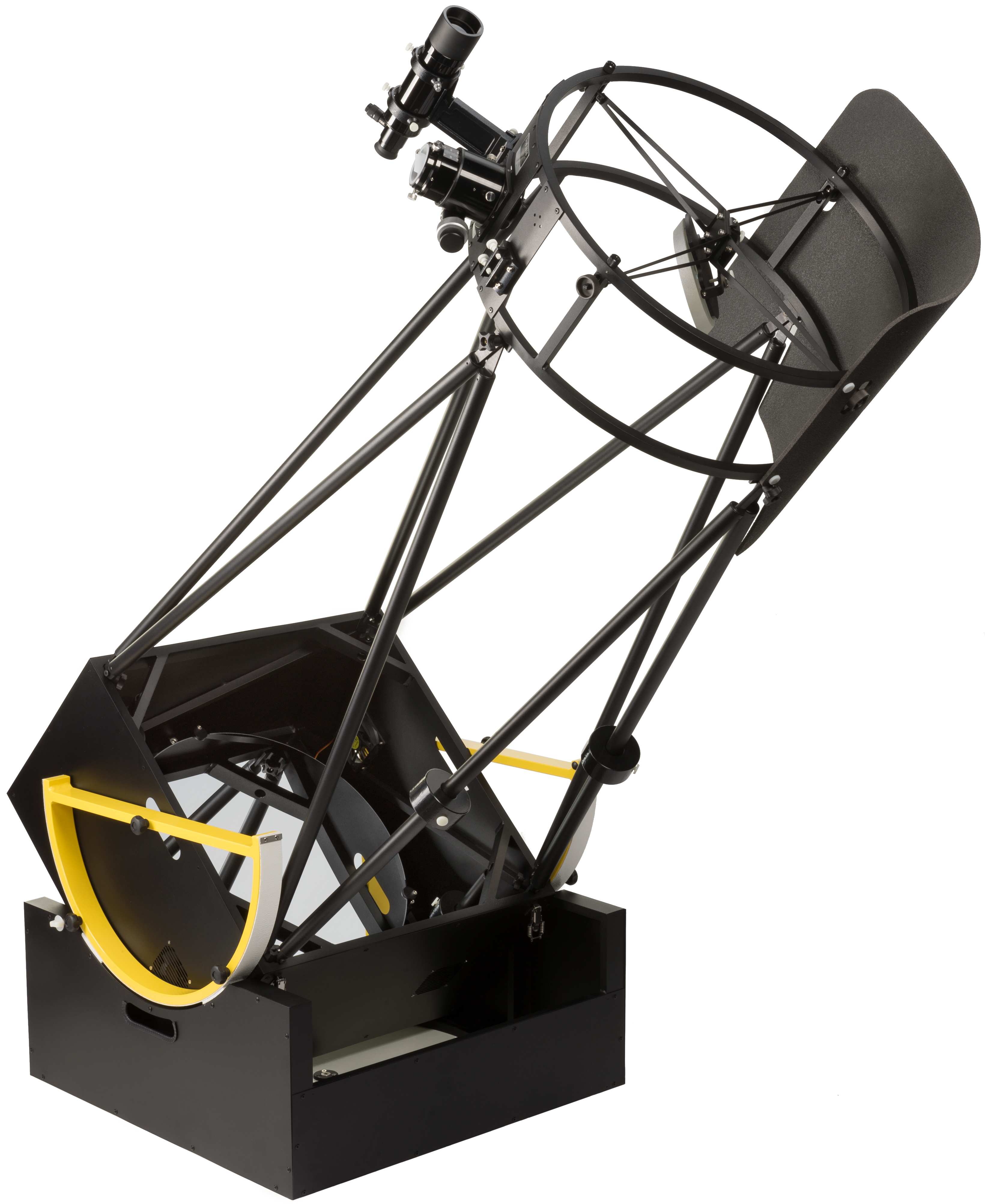 Detaily výbavy menších modelov Dobsonovho ďalekohľadu, ktoré sú už roky populárne, boli samozrejme prevzaté a dokonca výrazne rozšírené. V prvom rade je to, samozrejme, vynikajúca demontovateľnosť a prepraviteľnosť. Montáž a demontáž možno vykonať úplne bez použitia náradia. Primárne a sekundárne zrkadlá sa dajú nastaviť počas pozorovania a v každom prípade stačí pohnúť iba dvoma nastavovacími skrutkami. Vďaka použitiu presných guľových hláv v bunke primárneho zrkadla a presného závesu pre uchytenie sekundárneho zrkadla je nastavenie úplne plynulé a zaručuje vynikajúcu stabilitu nastavenia. Všetky spojovacie časti trubkových vzpier sú teraz vyrobené z CNC frézovaného hliníka a na mieste ich bez vôle držia montážne skrutky z nehrdzavejúcej ocele. Sekundárne zrkadlo sa teraz dá nastaviť aj v smere optickej osi pomocou nastavovacích skrutiek. Používa sa 2,5-palcový fokusér HEXAFOC s jemným nastavením 1:10, ktorý je už roky odskúšaný - to umožňuje pozorovanie bez vinetácie napriek rýchlemu ohniskovému pomeru. Druhá 40° posunutá montážna doska s pätkou hľadáčika umožňuje otáčanie hornej časti tubusu v spojení s výhodnou polohou hľadáčika alebo montážou prídavného hľadáčika TELRAD. Šesť nožičiek pod vahadlom poskytuje optimálnu stabilitu a zaručuje plynulé sledovanie v azimute. 4 menšie ventilátory namontované na boku zrkadlovej skrine a veľký ventilátor nainštalovaný pod primárnym zrkadlom umožňujú ešte rýchlejšie prispôsobenie sa okolitej teplote a znižujú seeing v dráhe lúča (odstránenie hraničnej vrstvy). Bočné výškové kolieska sa teraz dajú pohodlne uložiť do penových vložiek zrkadlovej skrine.