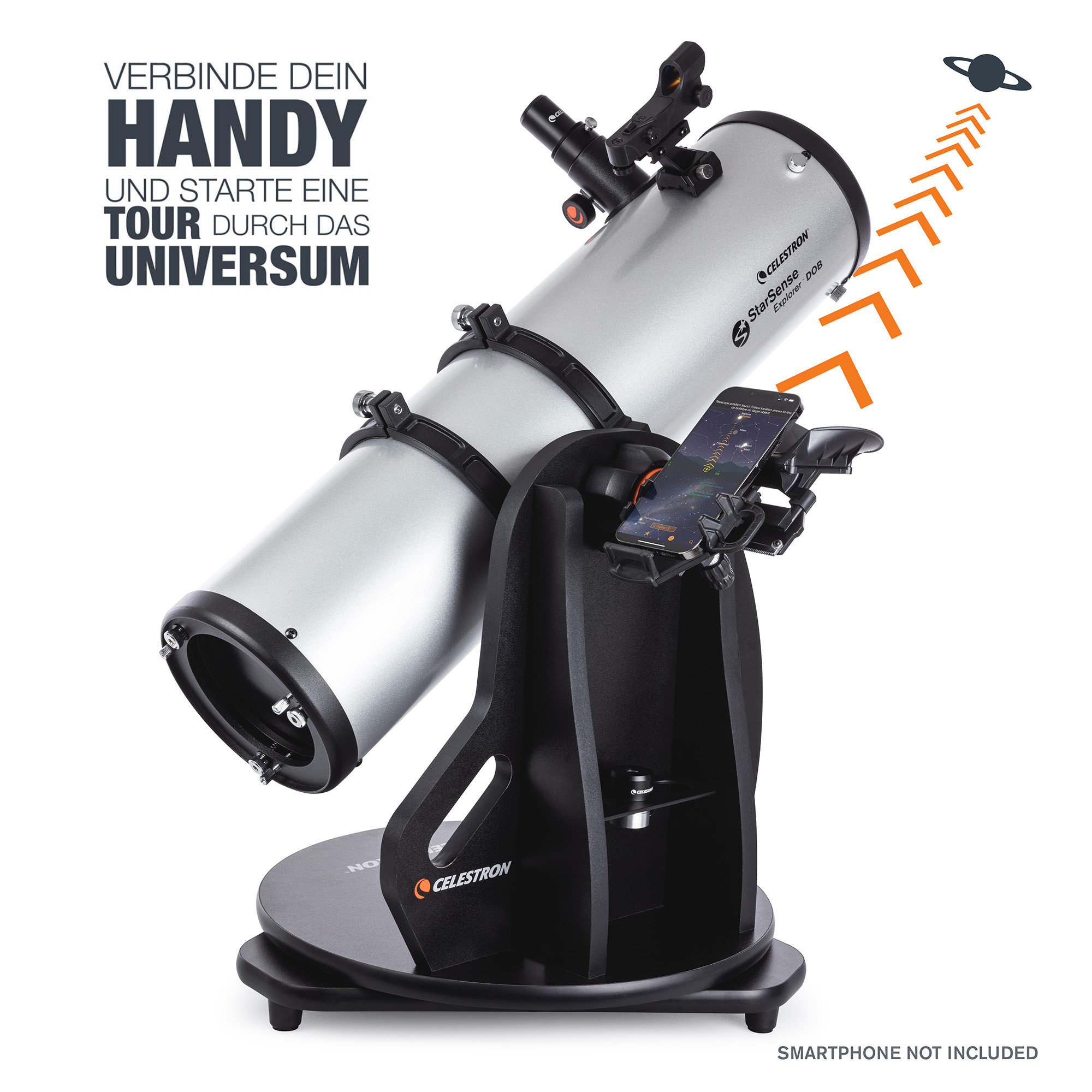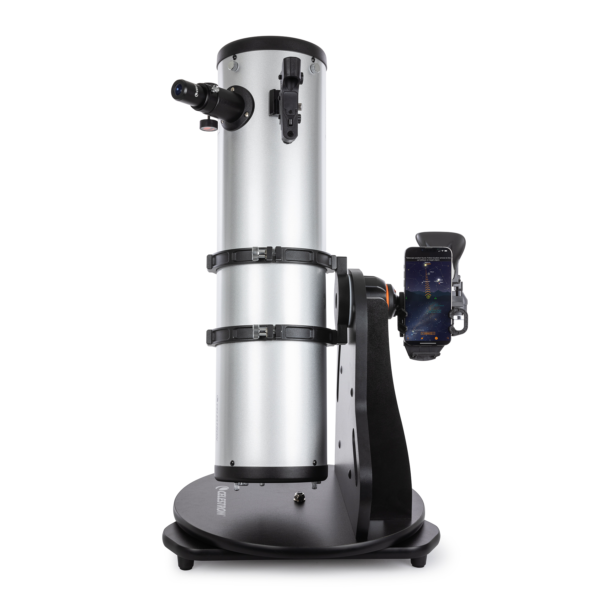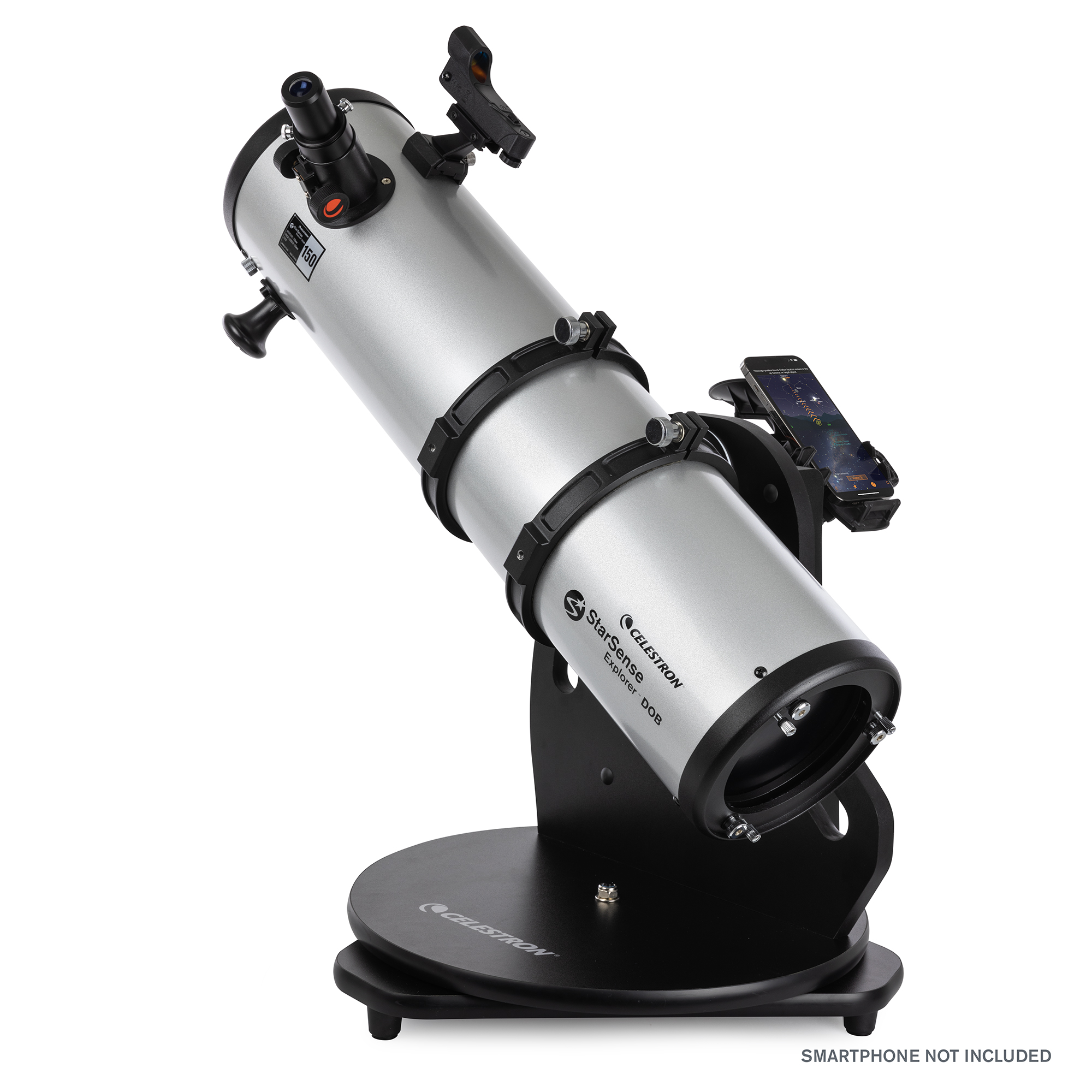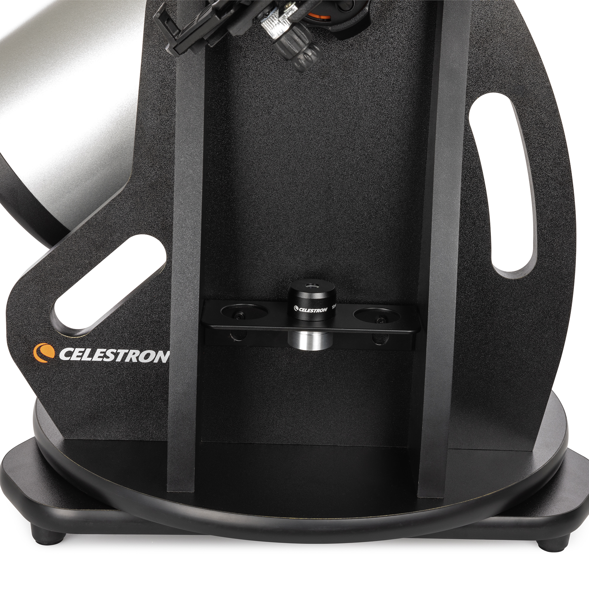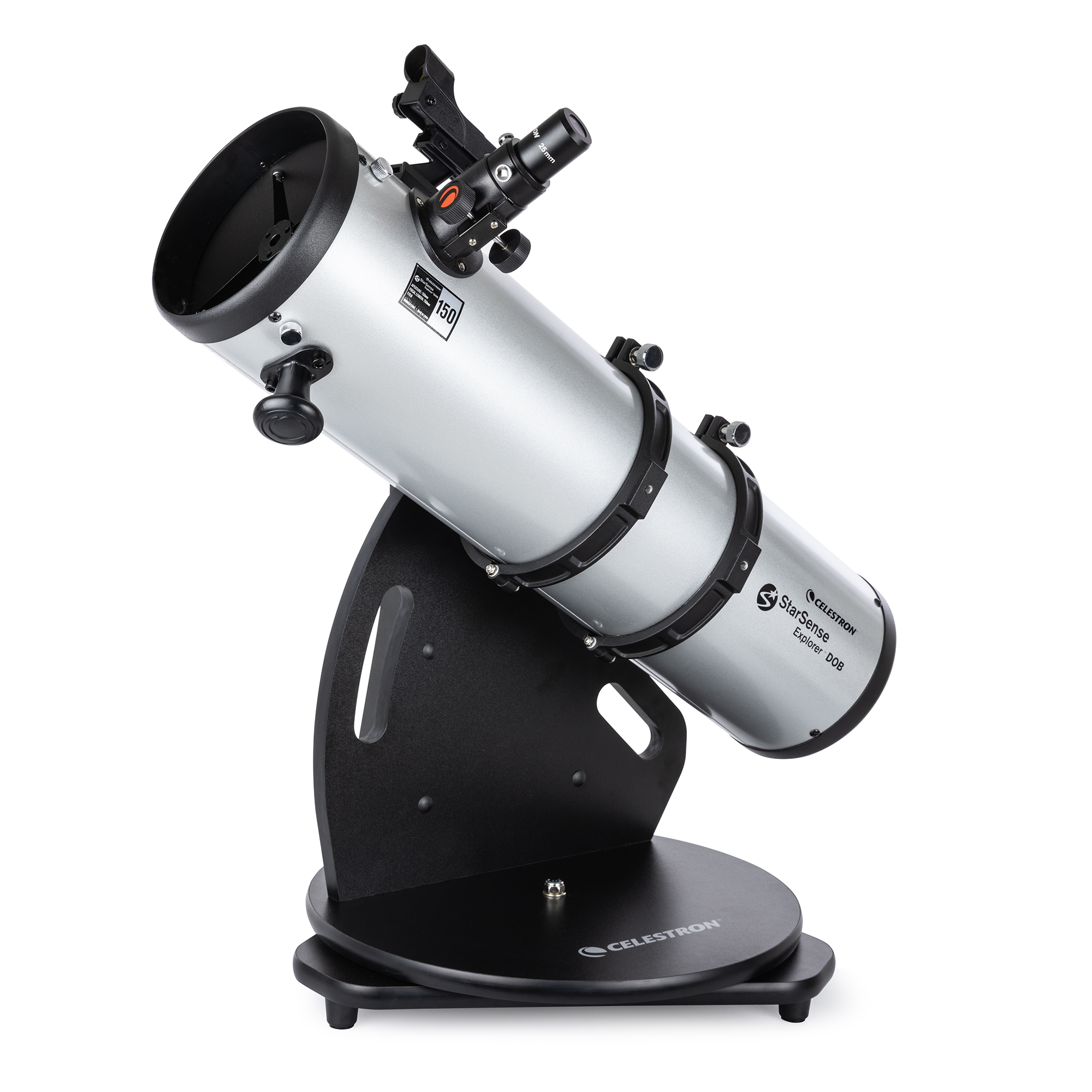 Stabilná Dobsonova stolová montáž poskytuje robustnú základňu pre teleskop. Je kompaktný, ľahký a ľahko sa prenáša, takže je ideálny na cestovanie. Konštrukcia montáže uľahčuje prístup k okuláru najmä deťom. Teleskop môžete umiestniť aj na stabilnú platformu, napríklad na stôl alebo kapotu auta, aby ste ho dostali do pohodlnej výšky na pozorovanie. Pre ešte väčšie možnosti pozorovania môžete použiť voliteľný statív Statív Celestron pre stolové ďalekohľady StarSense Explorer (#820955 , . € 199,- ) možno dokúpiť
