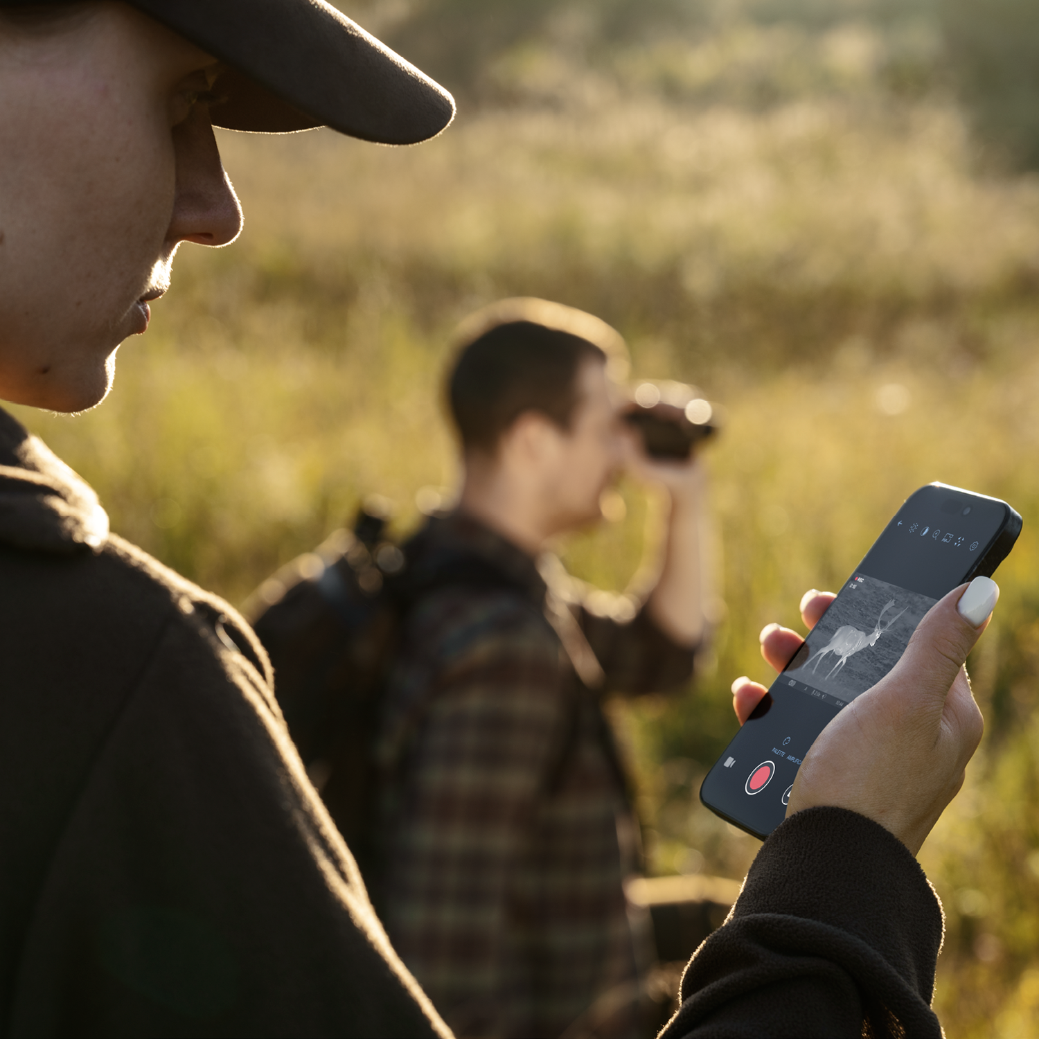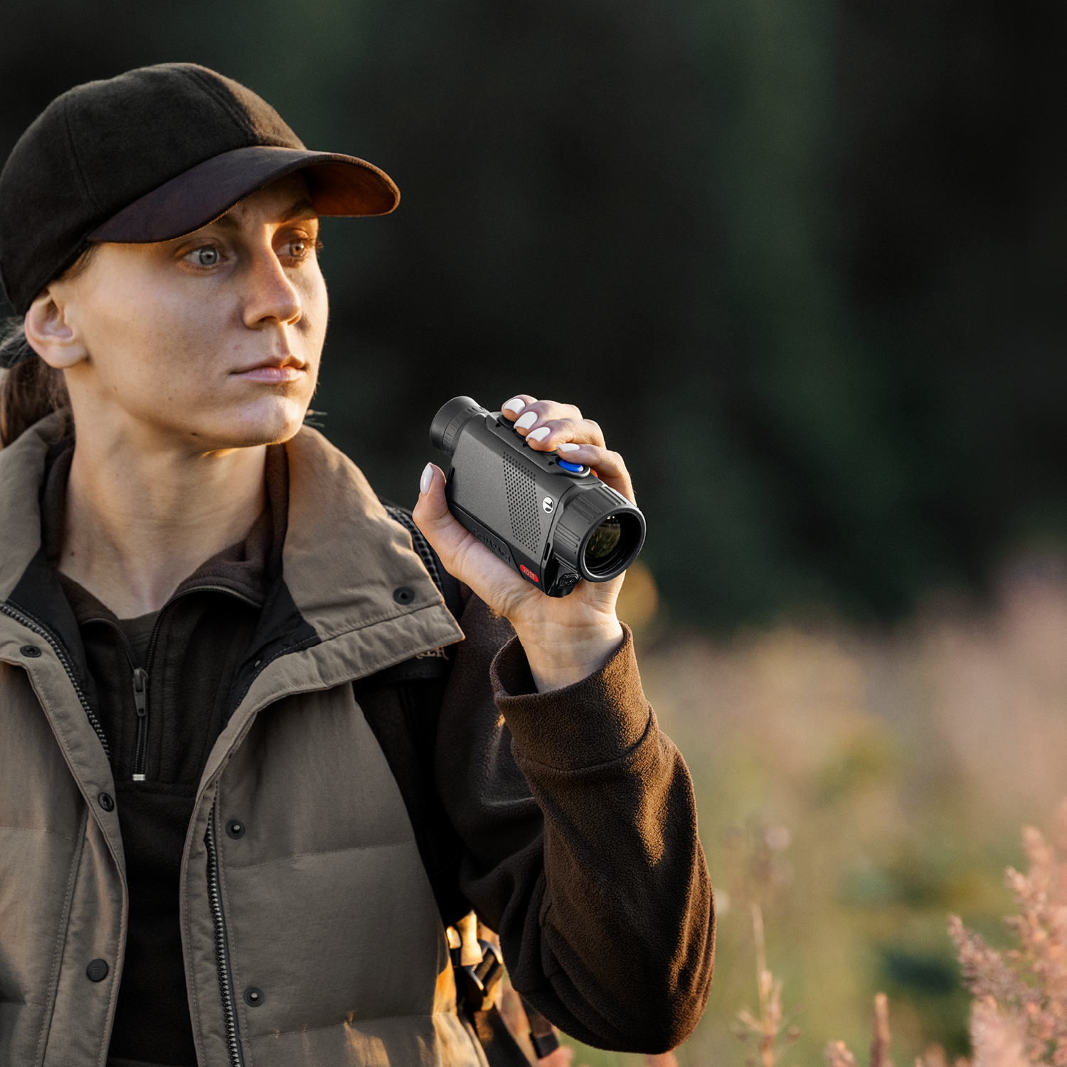 Mikrobolometrický senzor 640×480 px s pixel pitch 12 µm poskytuje ostrý obraz pri love, kontrolách a skenovaní terénu. Systémové NETD < 25 mK zlepšuje separáciu objektov pri vlhkosti a nízkych teplotných rozdieloch.