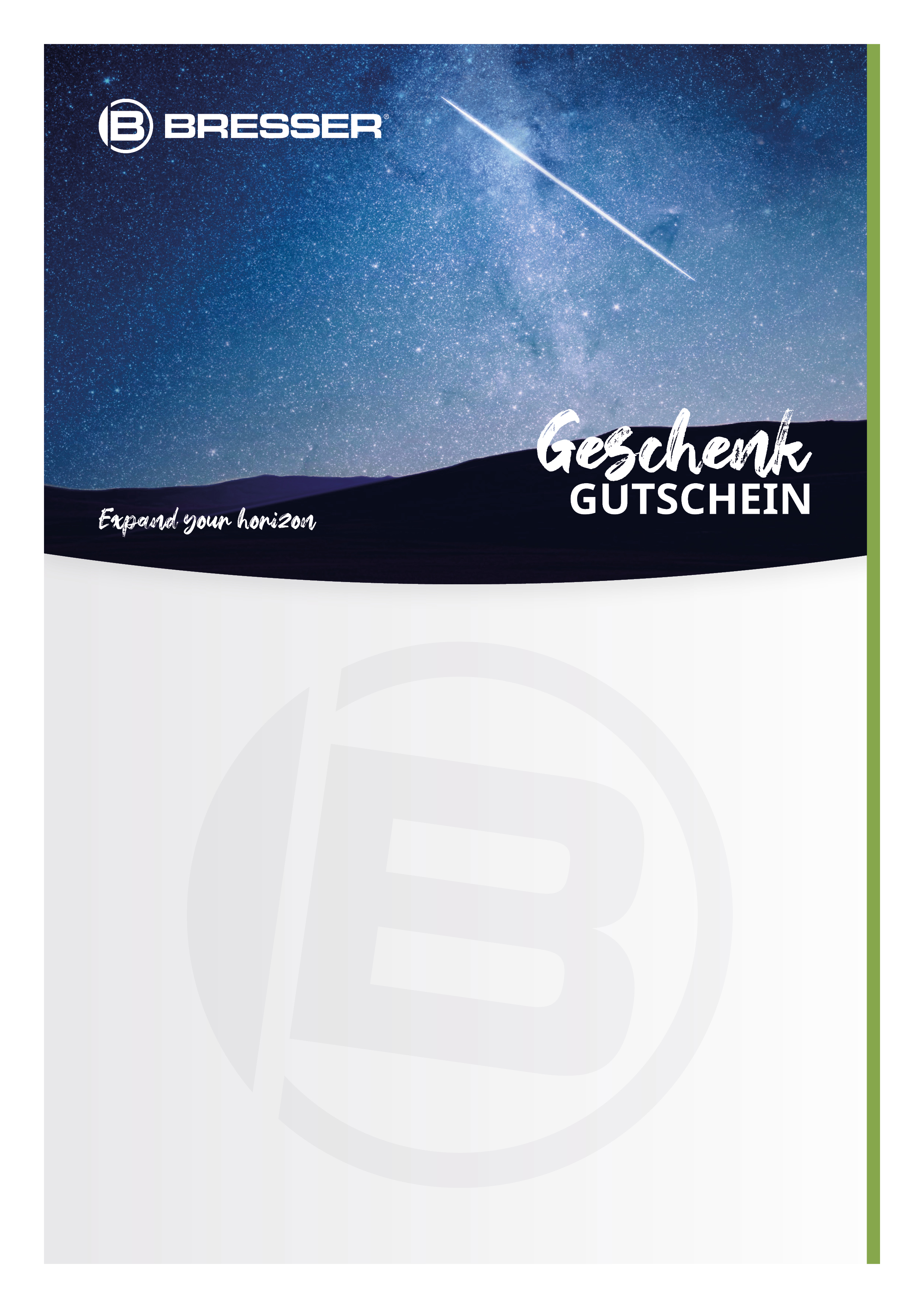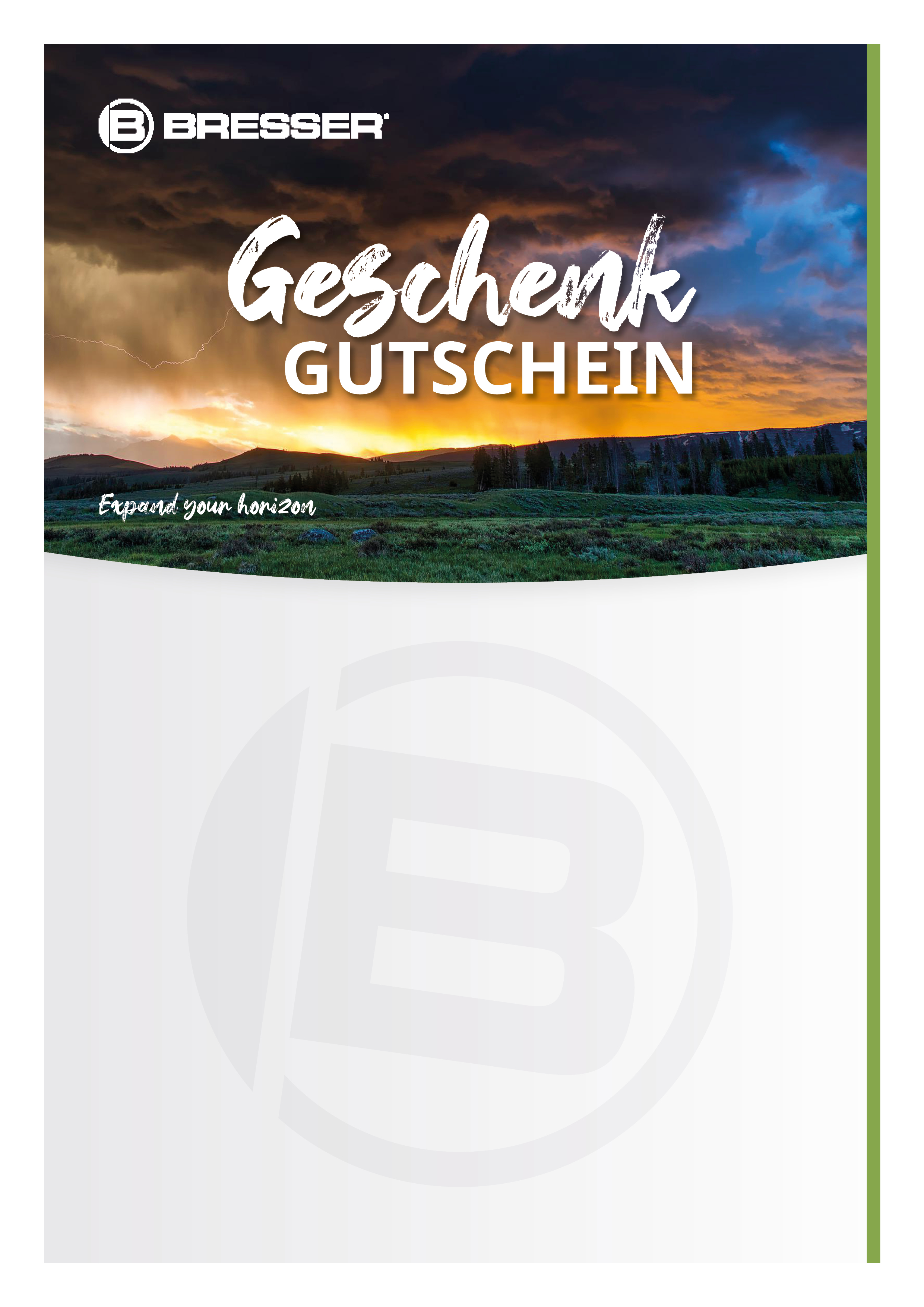 Dôležité: Bez ohľadu na to, ktorý motív si vyberiete, každý darčekový poukaz môžete samozrejme uplatniť v celom obchode na bresser.de. - Zadajte svoje meno a meno príjemcu (príjemcov). Potom môžete napísať správu v rozsahu až 300 znakov, aby sa váš darčekový poukaz stal veľmi osobným darčekom.