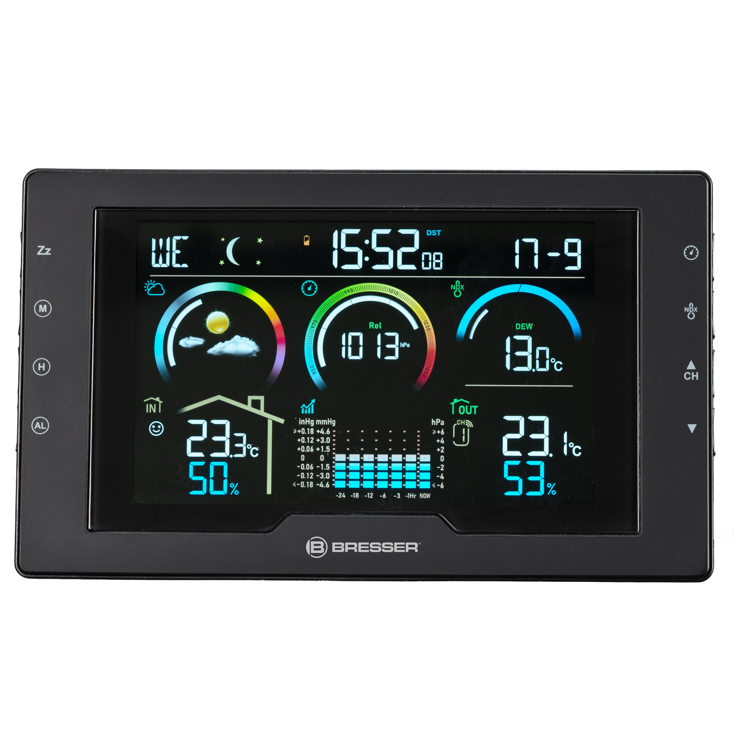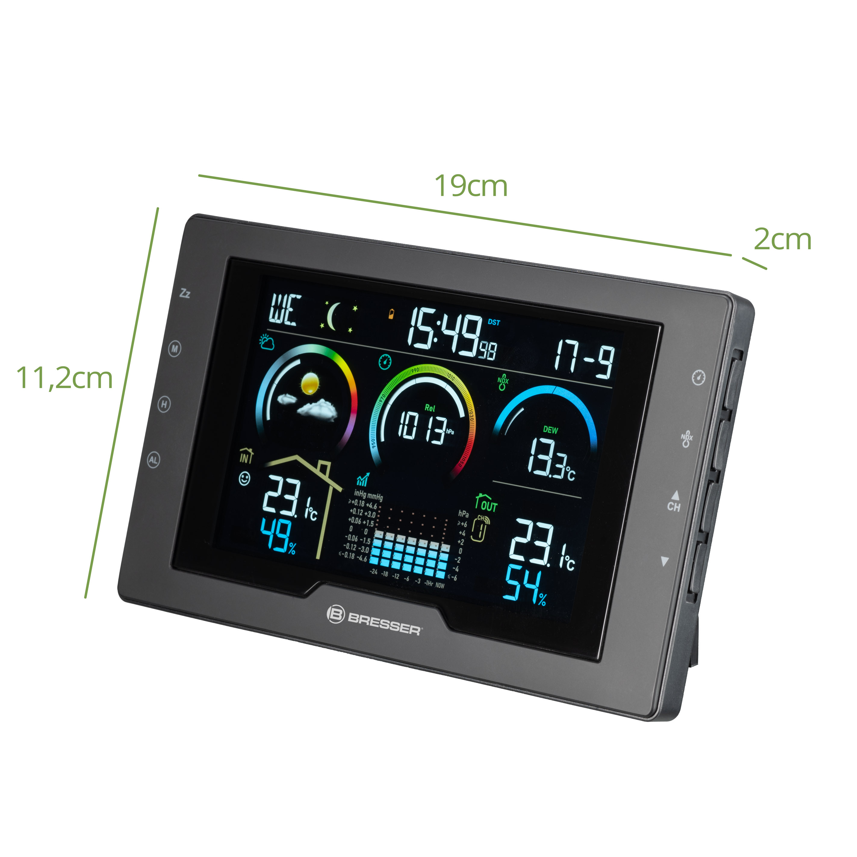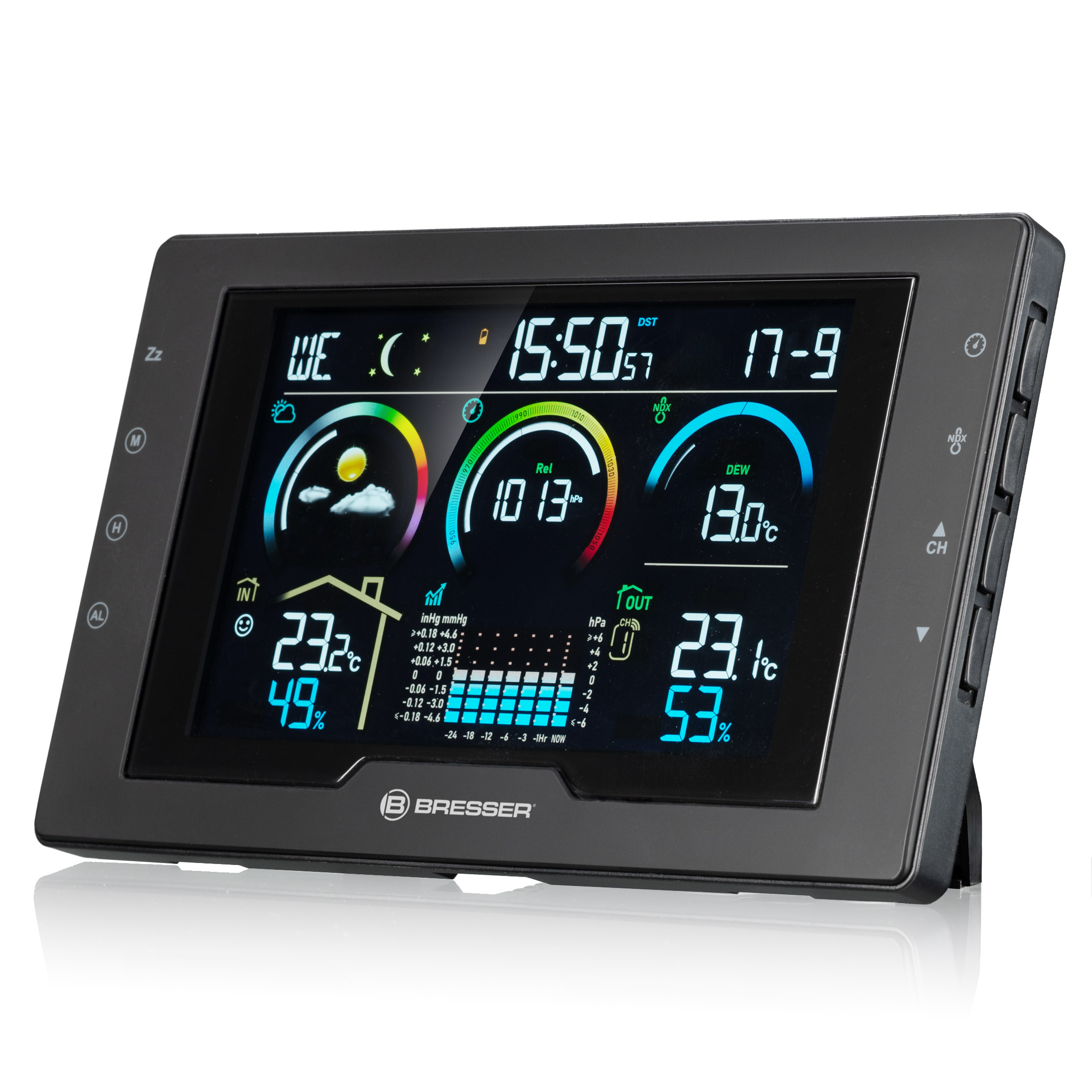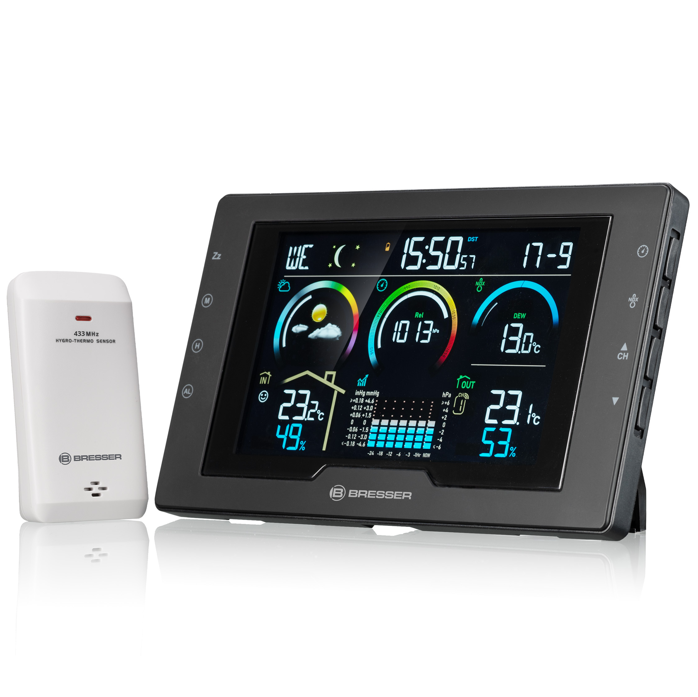 Silný sveter alebo tričko? Krém na opaľovanie alebo dáždnik? Stačí sa pozrieť na grafickú predpoveď počasia na meteorologickej stanici a hneď budete poznať odpoveď. Presné meranie vonkajšej teploty a vlhkosti vám navyše ukáže, aká je poveternostná situácia priamo pred vašimi dverami. Praktický index počasia pre rosný bod a index tepla, ako aj meranie tlaku vzduchu s grafom priebehu dokonale dopĺňajú váš klimatický prehľad.