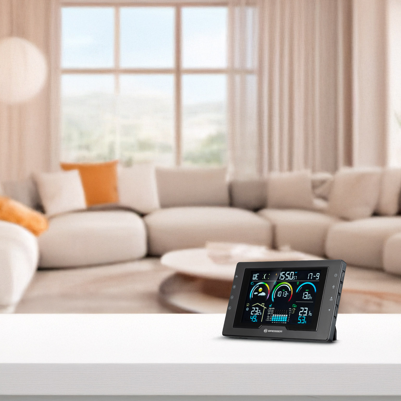Príliš suchý vykurovací vzduch v obývačke alebo príliš vysoká vlhkosť v kuchyni? Praktický ukazovateľ komfortu vám na prvý pohľad ukáže, či je vnútorná klíma stále tak akurát. Štýlová základňová stanica s integrovaným teplomerom a vlhkomerom zaznamenáva aj aktuálne namerané údaje o teplote a vlhkosti v miestnosti. A vďaka praktickej pamäti max./min. hodnôt môžete mať prehľad o denných maximálnych a minimálnych hodnotách - a včas si zabezpečiť čerstvý vzduch.