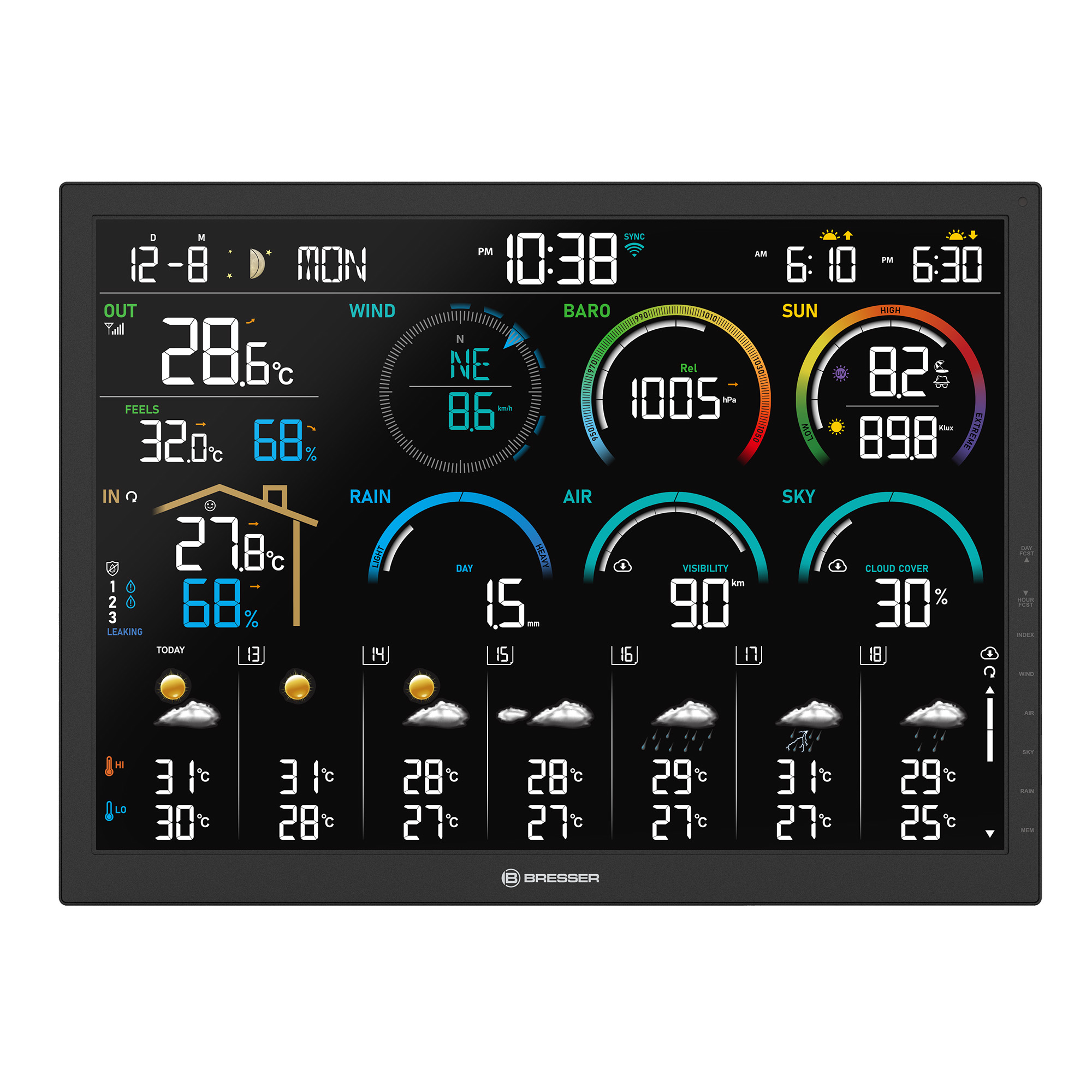 Meteostanica BRESSER 4CAST 18,5" WLAN so senzorom 8 v 1 ponúka vždy komplexný prehľad o počasí. Na obrovskom displeji je totiž miesto pre všetky druhy lokálne nameraných a internetových údajov týkajúcich sa klímy. Skutočné zaujímavosti: podrobná predpoveď počasia až na 14 dní a teplota vlhkého teplomera na zemeguli s úrovňou tepelného stresu. A vďaka pripojeniu WLAN možno informácie o počasí vyvolať bleskovou rýchlosťou kedykoľvek a kdekoľvek.