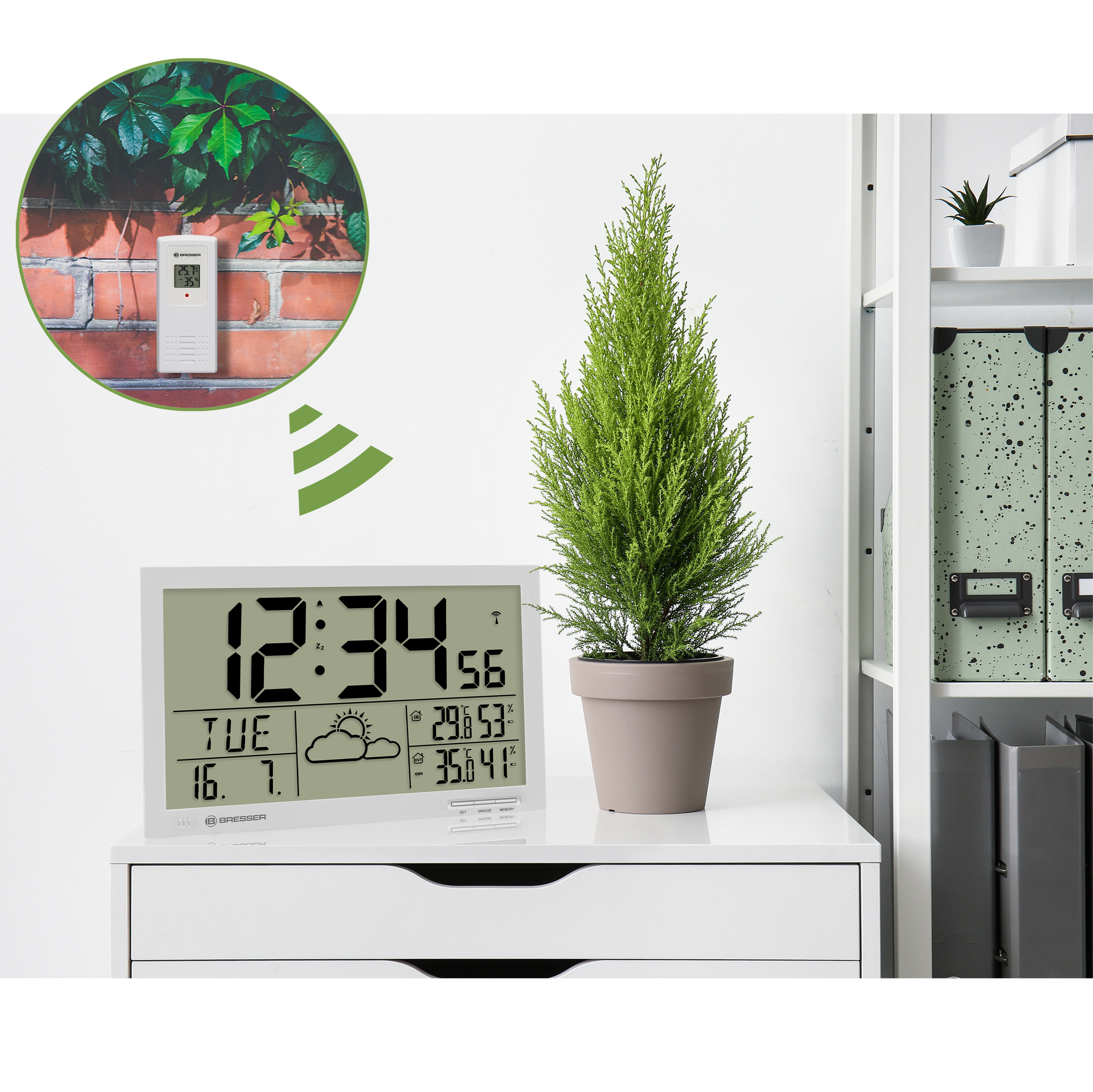 Čas sa nastavuje automaticky prostredníctvom časového signálu DCF, rovnako ako prepínanie na letný alebo zimný čas. Nástenné meteorologické hodiny vám tiež umožňujú neustále sledovať teplotu a vlhkosť vzduchu a poskytujú predpoveď počasia na nasledujúcich 12 až 24 hodín.