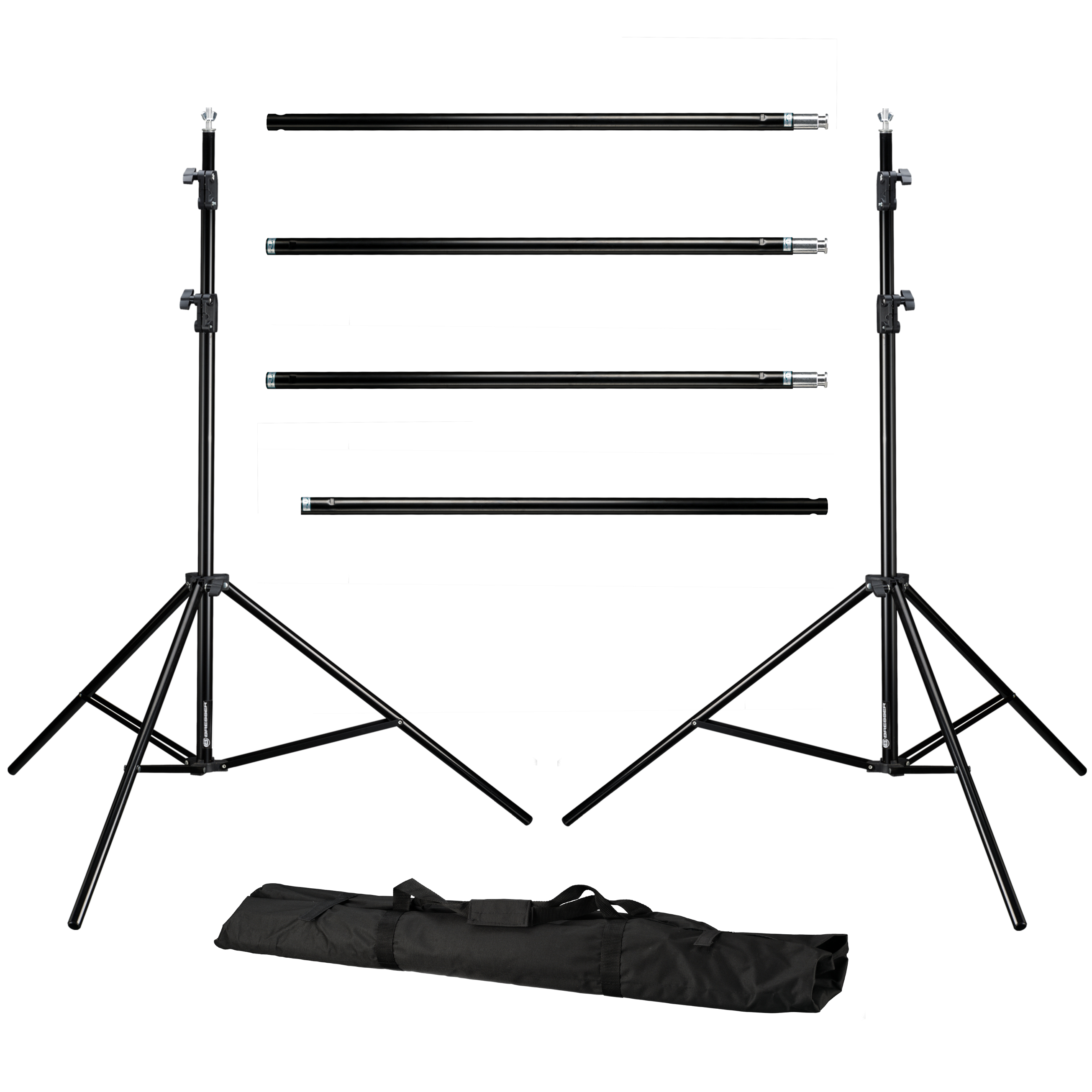 Prenosný systém pozadia BRESSER BR-D23 sa skladá z dvoch pevných a stabilných hliníkových stojanov na lampy, ktoré možno nastaviť do výšky až 240 cm. K týmto stojanom je pripevnená priečka pozostávajúca zo 4 segmentov s flexibilnými rozmermi 150 cm, 225 cm alebo až 300 cm .