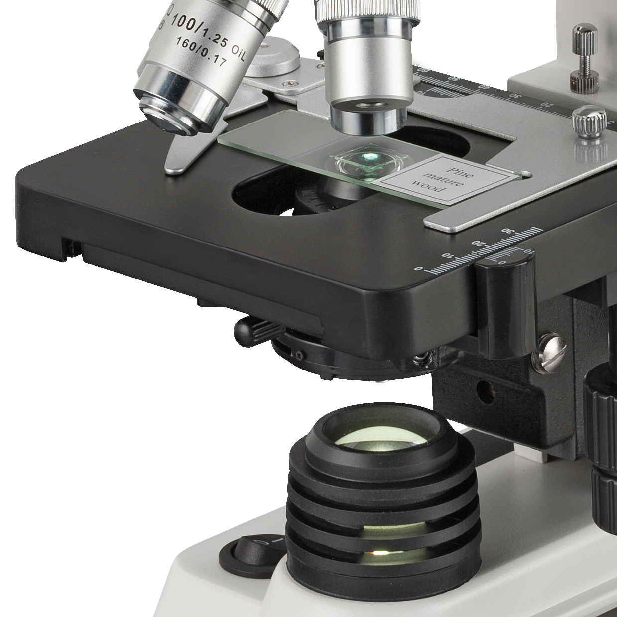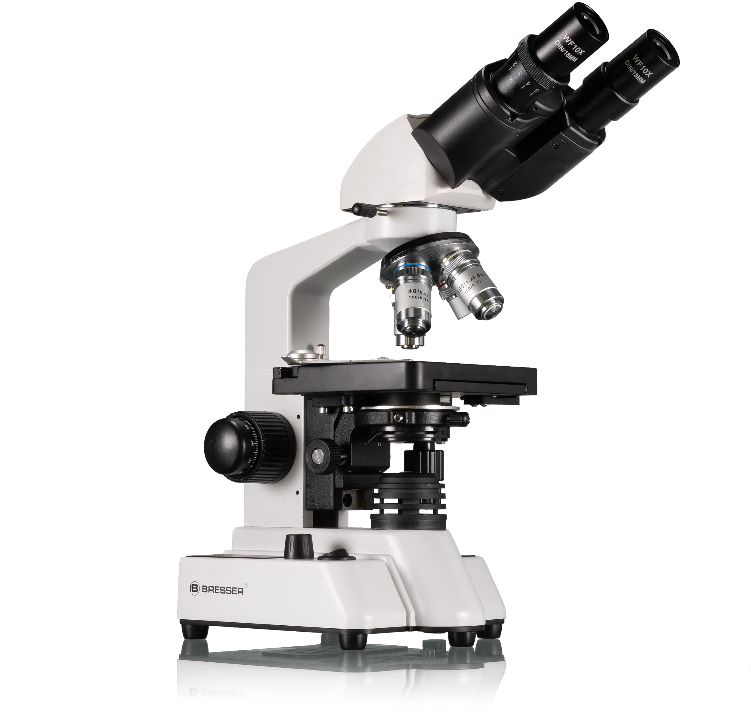 So 4 objektívmi a jedným (vymeniteľným) párom okulárov dosahuje mikroskop široký rozsah zväčšení 40x-1000x. Vďaka tomu je optika vhodná na mnohé náročné aplikácie. Pri mikroskopovaní s ponorením do oleja s objektívom 100x je imerzný olej dokonca súčasťou dodávky. Aby sa zabránilo poškodeniu, sú objektívy 40x a 100x odpružené.